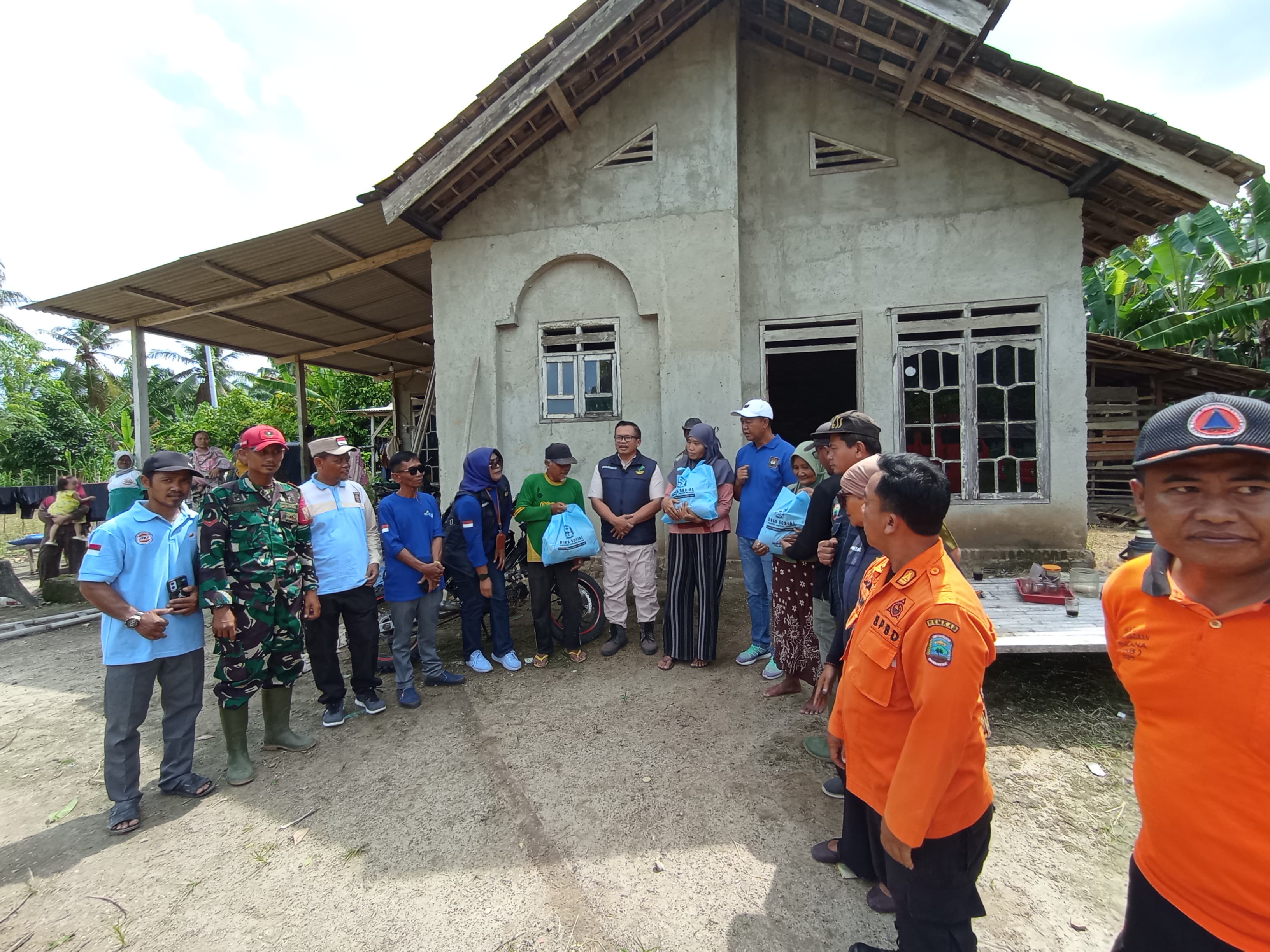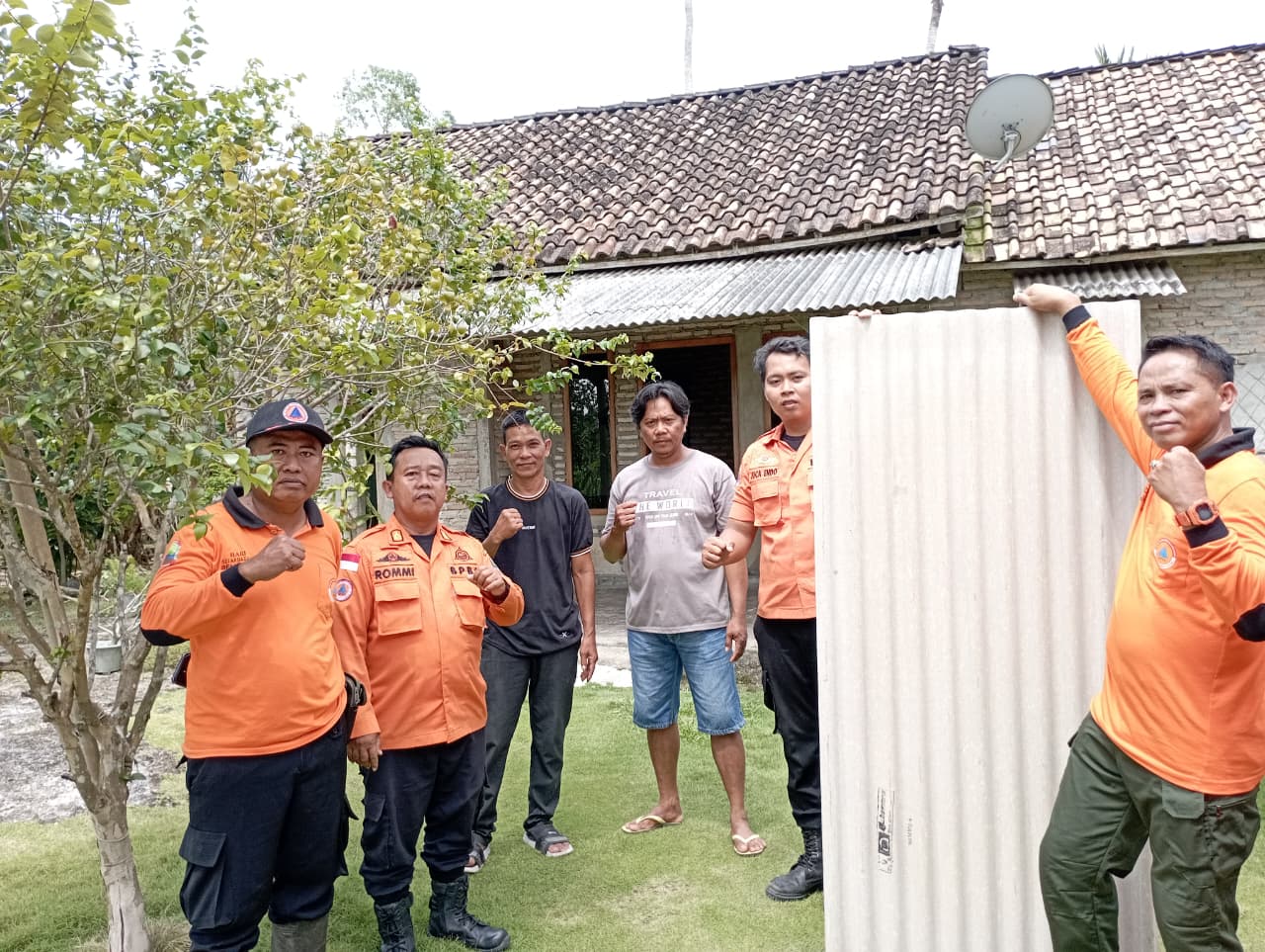 Personel BPBD Lampung Selatan bersama warga dan perwakilan instansi terkait menyerahkan bantuan asbes secara langsung di lokasi terdampak.