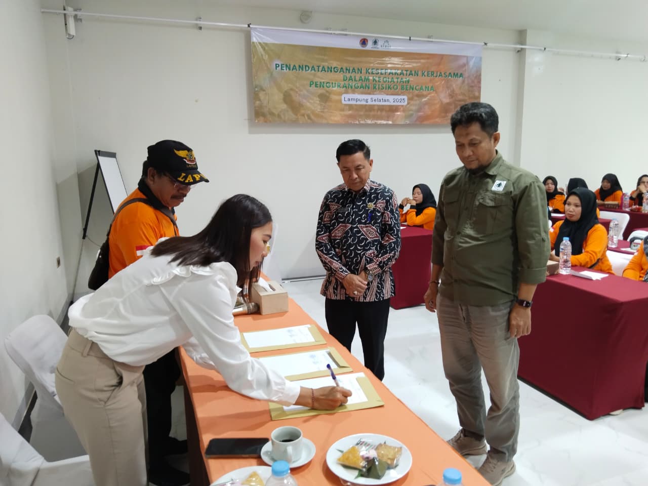 Foto: Plt. Kalaksa BPBD Lampung Selatan, Maturidi, S.H., didampingi perwakilan mitra, menandatangani dokumen kesepakatan kerjasama.